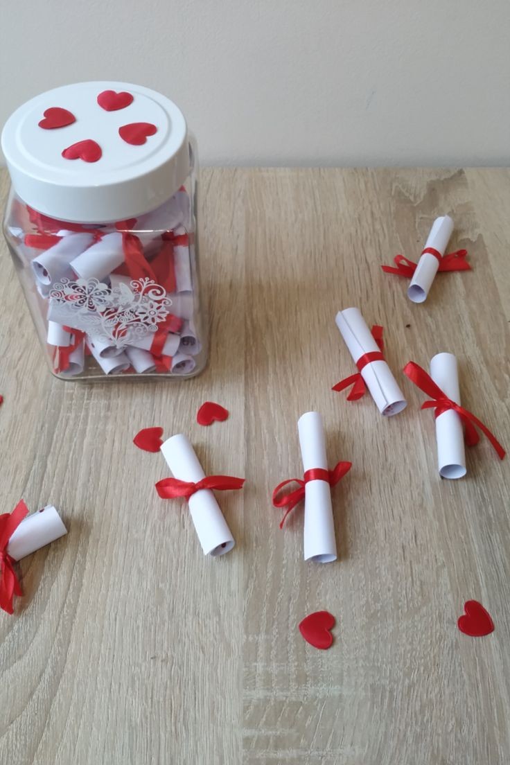 Staklenka 'Razlozi zašto te volim' zamišljena je aktivnost za vas i vašeg partnera kako biste ih podsjetili zašto i koliko ih volite i što oni vama znače. Uzmite staklenu posudu i u nju napišite slatke porukice svojoj voljenoj osobi koje će ona moći vaditi iz dana u danu. Kako joj dođe. Jednostavno zapišite svoje porukice na kartice u obliku srca.